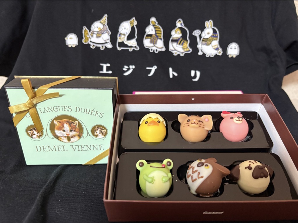 ごろう様に今年のGodivaをささげる。2026年バージョンのコンセプトはアリスのお茶会らしい。当然、チェシャ猫がめだつけど、鳥もいる。箱の上にたつごろう公の立ち姿がりりしい(冒頭の写真)。ちなみに、気候変動とロシアのせいで毎年毎年チョコの値段が上がり、今年は7000円近い。