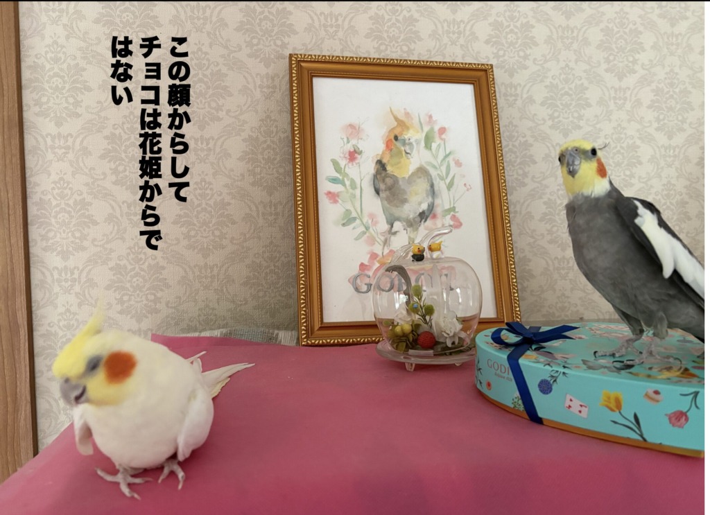 共通点がみな青色の濃淡の模様いり。なので青色はつとめて室内で着ないようにしている。仮説だけど、濃い青色って天敵である砂漠の蛇の色ににているからかも。タカシマヤのバレンタイン特設コーナーで、ピンク色で鳥をさがしたらゴンチャロフの動物チョコがささったので買う(箱はピンク)。