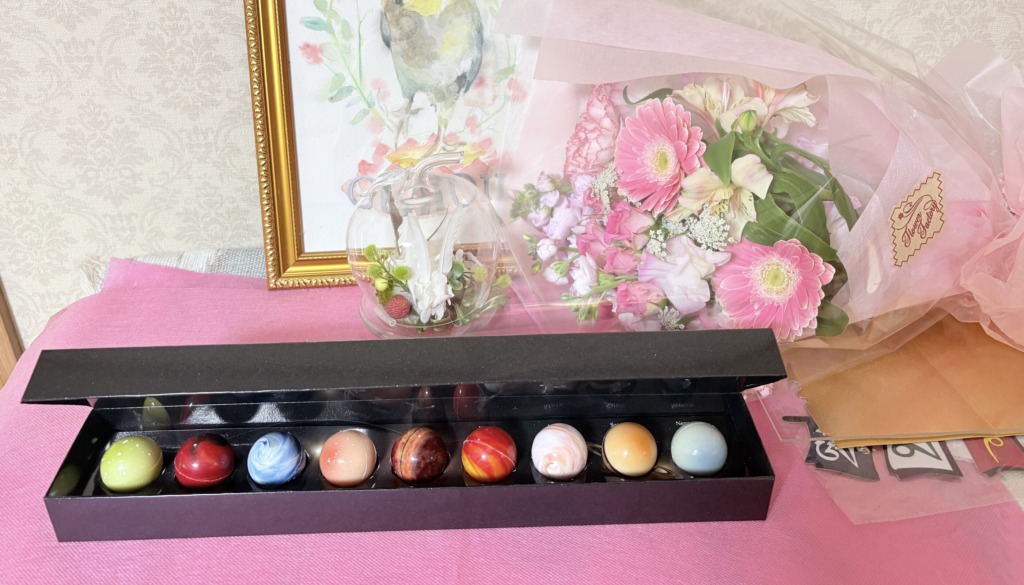 この日、あくび母さまより、リーガロイヤルの太陽系チョコ、宇治小山園の抹茶ョコレート、それに高野山別格本山南院の干支のおまもりを拝受する。お守りは二つあるのでごろう公と花姫のかごにつける(すでにカゴには多数のお守りがさがってるw)。