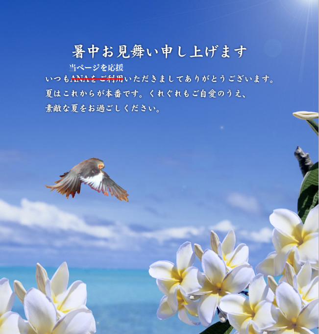 ANAの暑中お見舞いのパロディです。ホンモノはごろうちゃんの場所にヒコーキが飛んでます。Co2の大排出源のヒコーキよりもごろうちゃんの方がはるかにエコでございます。 下には昨日とったごろうちゃんのご真影です。ごきげんです。