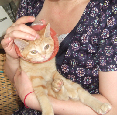 というわけで、つまりここ一年半、我が家は猫のいない状態が続いていました。しかし、09年八月一日、茶トラの子猫をお迎えしました。フリー・チベット関係の方のおうち周辺で生まれた由緒正しいノラの赤ちゃんです。まだ本当に小さな赤ちゃん猫の時に結膜炎にかかってあまりにひどい状態だったので、フリー・チベットさんに保護されたとのこと(写真は育ての親フリーチベットさんとるり)。