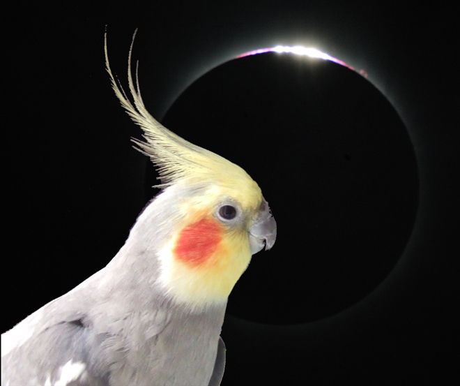 今年、東京で日蝕がありました。蝕が最大になった時、動物たちが異常行動をとるというので、ごろう様を注視していましたが、いつもと同じで秘密基地で静かに昼寝をしておられました。そこで、表に出てみると、これまたワカケホンセイインコがいつものようにアンテナの上で、「クキュークキュー」と鳴いておりました。我が家のセキセイたちも変わりなし。