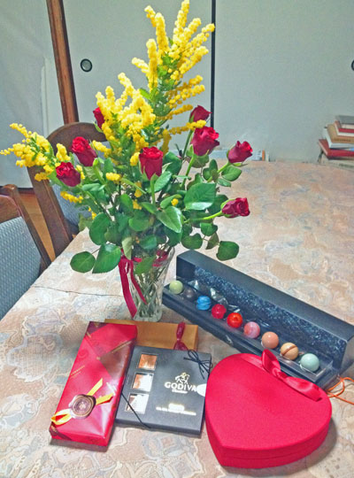 さて、今年も私からはオカメインコをイメージした赤と黄の花をバラとミモザで青山フラワーでアレンジしてもらいました。チョコレートは帝国ホテルのガルガンチュアの金の箱を一番お気に召していたのですが、モデルチェンジで箱が黒くなったため、今はGodivaの金箱がセカンドお気に入りとなっております。去年のGodiva箱と今年のGodiva箱を並べてみました。この箱は主に本棚上から私の頭上をめがけて落とすのに使われています。なんてカワイイのかしら。モロゾフはちょっと帝国ホテルと箱の感じが似ているので買ってみました。