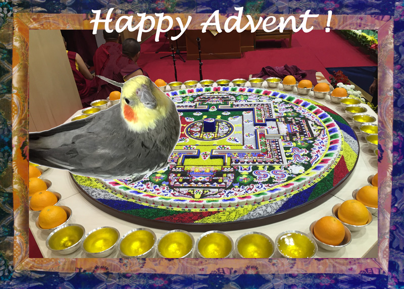 二枚目の写真でごろう様と一緒に写っているのは、バースデーケーキではなく、2016年10月30日の新月の日に最初の砂がおかれたチベットの砂マンダラである。砂マンダラは本尊の力を光臨させる場所であり、新月の日に最初の砂をおき、満月の日(今年の場合はスーパームーン)に灌頂を行った後に壊す束の間の芸術品である。今回この砂マンダラは展示のために壊されずに科学の力で固められる。 美しい五色の砂はそれぞれ仏の意識の五つの側面(五智)を示しており、形は東西南北に門のある仏の宮殿の形をしている。今年9月母はアンコールワットをはじめとするクメール王朝の遺蹟を拝観してまわったが、クメール帝国の都城や寺はみな密教のはやった時代に作られているので、リアルこの砂マンダラを立体にしたような東西南北に門を開いた形である。