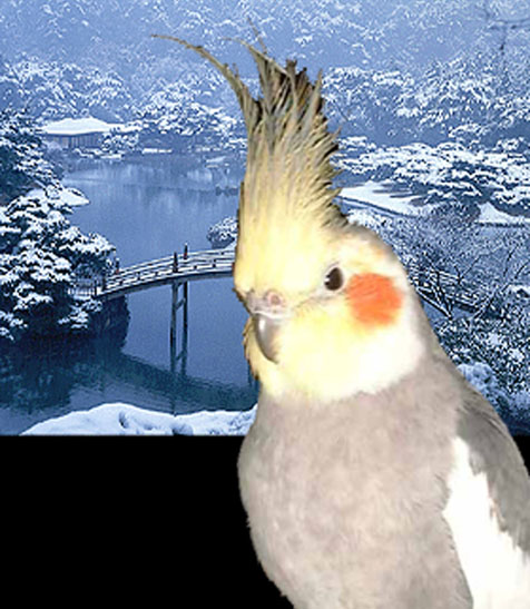 ナレーション:そこには、風雅に墨絵の世界に溶け込むジャパニーズ=オカメインコの姿があった(こんなことしてるまに仕事しろよ)。