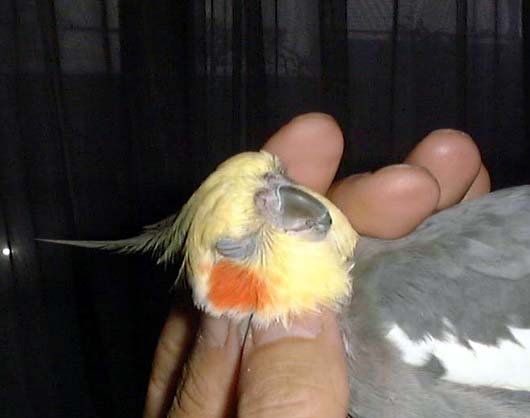 ナレーション:仲のいいカップルの小鳥がお互いの顔の羽をくちばしで整えあっているのを見たことありませんか? そう、小鳥は親交を深める時、互いに、目・耳まわりの羽毛を整えあうのです。もちろん、手乗りの小鳥の場合は人間が同じことをすると喜んでもらえます。さて、ごろうちゃんの場合わ・・・・。