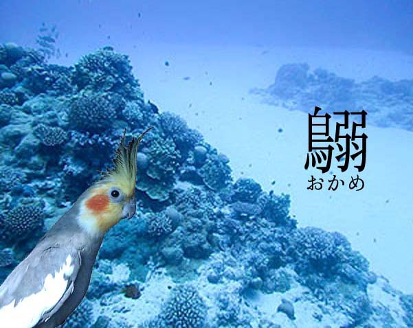 はいみなさんコンニチワ。あまりにも暑いので、気分だけでも涼しくいこう。というわけで、一羽納涼企画「珊瑚礁とオカメインコ」をお届けいたします。夏のオカメインコのポイントは、細い体に長い首、まっぐな背筋。35度をこえればくちばしが半開きとなりとさか立ちっぱなし。全身であついと訴えます。ちなみに25度をきると今度は寒いといってふくらむのですから、適温の幅のせまいインコですね。