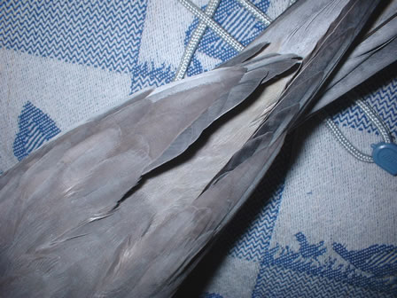 ところがこの日は違った。戻ってきたら床にいたのである。床に降りることは禁止しているので、おかしいと思ってよくみると、右翼の風切り羽が異様に短い。では、飛ぼうとして床に落ちたのか。急いで、籠を確認しにいったら、籠の床に五枚も風切り羽がおちていた。