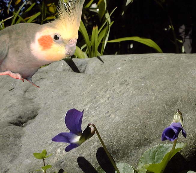 お庭のスミレです(註:合成です。マネして愛鳥に逃げられないように!)