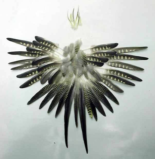 すべて一枚一枚が線対称に出てきて、どれも生える場所によってちょっとずつサイズや色がかわっているのです。写真でおみせてしてるのはボクの去年きていたモノですが、今年のヤツはもっとツヤピカに光沢がまし、しっぽも風きりももっと長くなってきています。それに、シマシマの羽根はいまは立派な無地のダークグレーになっています。