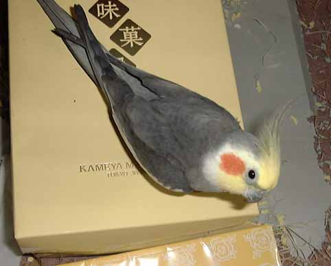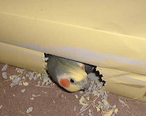 番は僕があけた穴で、(2) 番にみるようにこの反対の側面は全開しています。この穴はママの見張り足が側にあることを確認するために開けました。一人でもぐっていると怖いんだもん。写真はママの足がみえなくなったので、顔をだして確認しているところです。中は巣材にもらった木屑と紙カスでふかふかになっています。ちなみに、この巣にお迎えするお嬢さんはまだ決まっていません。ママが参加しているオカメインコのMLにいいお嬢さんがいたのですが、お住まいが兵庫県なのと一人娘であるということで、結婚しても七夕状態になるとかで・・・。でも、今はこの巣があるだけで幸せだから、女の子はいらないの。