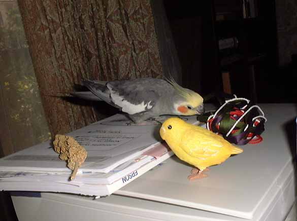 おととい私はお中元で頂いたばかりの赤のカジュアルウエアをきて、はじめての粟穂をごろうちゃんの前においてみました。ここで、普通のオカメインコなら、シャツの赤とはじめての粟穂に驚いて、羽軸おりまくり、鼻血だしまくりの流血パニックを起こすところです。しかし、ありとあらゆる色彩と物に囲まれて育ったごろうちゃんは、ご覧の通り泰然自若としたものでした。 しかし、ネコまで畏れないっつーのはどうにかしてくれないと・・・・。