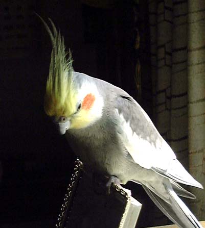 母: 「ちょっ待て! 何が浮気じゃ! たまたま伺ったお寺にいたルチノーのチャーリー君とお話しただけっつーの。まあ、誤解のないように説明しますとね、お寺の入り口に立っていますとね、"ヒューヒュー" という例の語尾下がりの寂しげなオカメインコの鳴き声がしたわけ。そこで方丈様に「オカメインコがいるんですか?」とお聞きしたら、方丈様がつれてきてくれたのが、チャーリー君だったの。折しも旅先でオカメインコの禁断症状がでていたところだったので、駕篭にはりついて口笛吹いたり、頭カキカキしたりしていたら、これが人見知りしない子でね、かわいーの。」