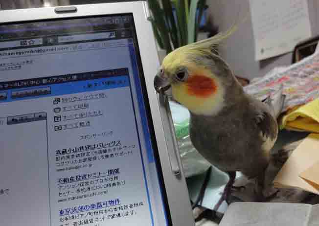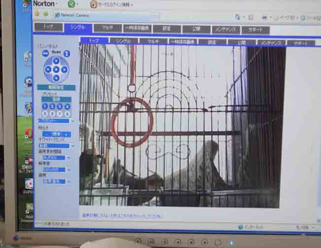 即座に、かごにお戻り戴いて、柔らかくて消化のいいゆでた枝豆、焼き芋、キャベツ、病鳥用フォーミュラなどをかごにいれる。そして、ダンナ様が何年か前の自分の誕生日にプレゼントしてくれた、「24時間ごろう様監視システム」を作動させる。 そう、ごろう様の前にカメラをおき、一挙手一投足を一階のパソコンから見張るのである。